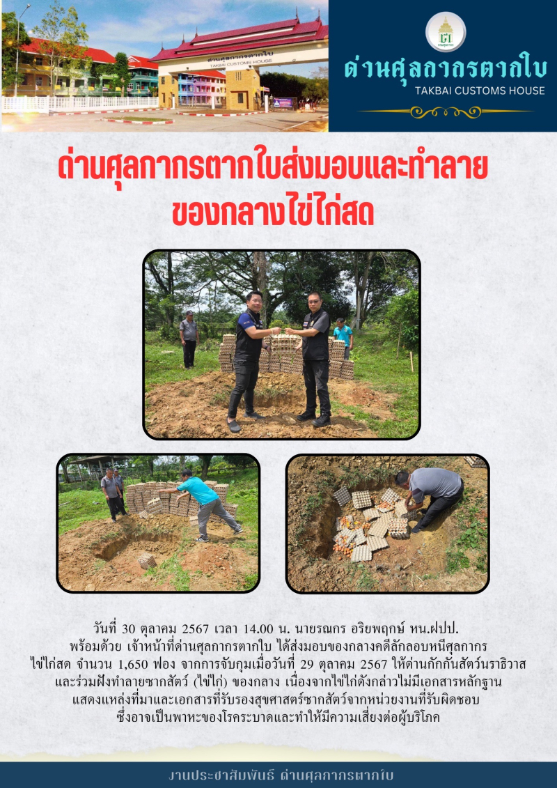 //++ด่านศุลกากรตากใบส่งมอบและทำลายของกลางไข่ไก่สด++//
