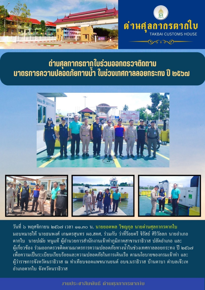 //++ด่านศุลกากรตากใบร่วมออกตรวจติดตามมาตรการความปลอดภัยทางน้ำ ในช่วงเทศกาลลอยกระทง ปี ๒๕๖๗++//