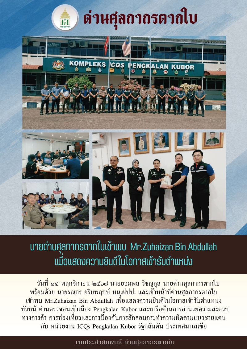 //++ด่านศุลกากรตากใบร่วมหารือหน่วยงาน ICQs Pengkalan Kubor รัฐกลันตัน ด้านการอำนวยความสะดวกทางการค้า การท่องเที่ยว และการลักลอบกระทำความผิดตามแนวชายแดน++//