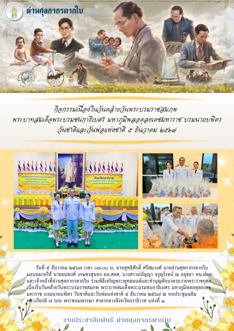//++ด่านศุลกากรตากใบ เข้าร่วมกิจกรรมเนื่องในวันคล้ายวันพระบรมราชสมภพพระบาทสมเด็จพระบรมชนกาธิเบศร มหาภูมิพลอดุลยเดชมหาราช บรมนาถบพิตร++//