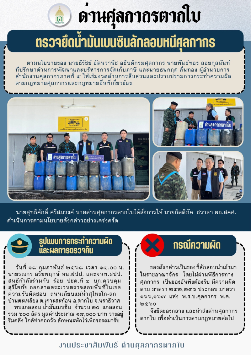 สอบถามข้อมูลเพิ่มเติมได้ที่ : ด่านศุลกากรตากใบ