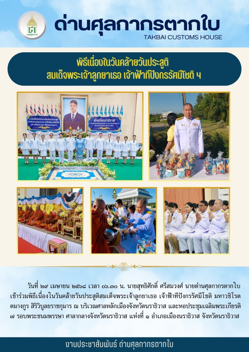//++นายสุทธิศักดิ์ ศรีสมวงศ์ นายด่านศุลกากรตากใบ เข้าร่วมพิธีวันคล้ายวันประสูติสมเด็จพระเจ้าลูกยาเธอ เจ้าฟ้าทีปังกรรัศมีโชติฯ 29 เมษายน 2568++