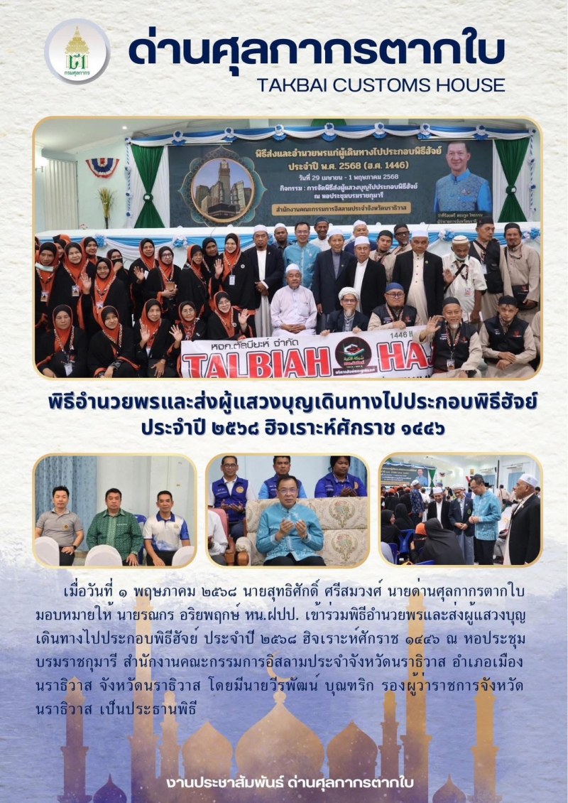 //++ด่านศุลกากรตากใบ ร่วมพิธีอำนวยพรและส่งผู้แสวงบุญเดินทางไปประกอบพิธีฮัจย์ ประจำปี 2568 ฮิจเราะห์ศักราช 1446++//