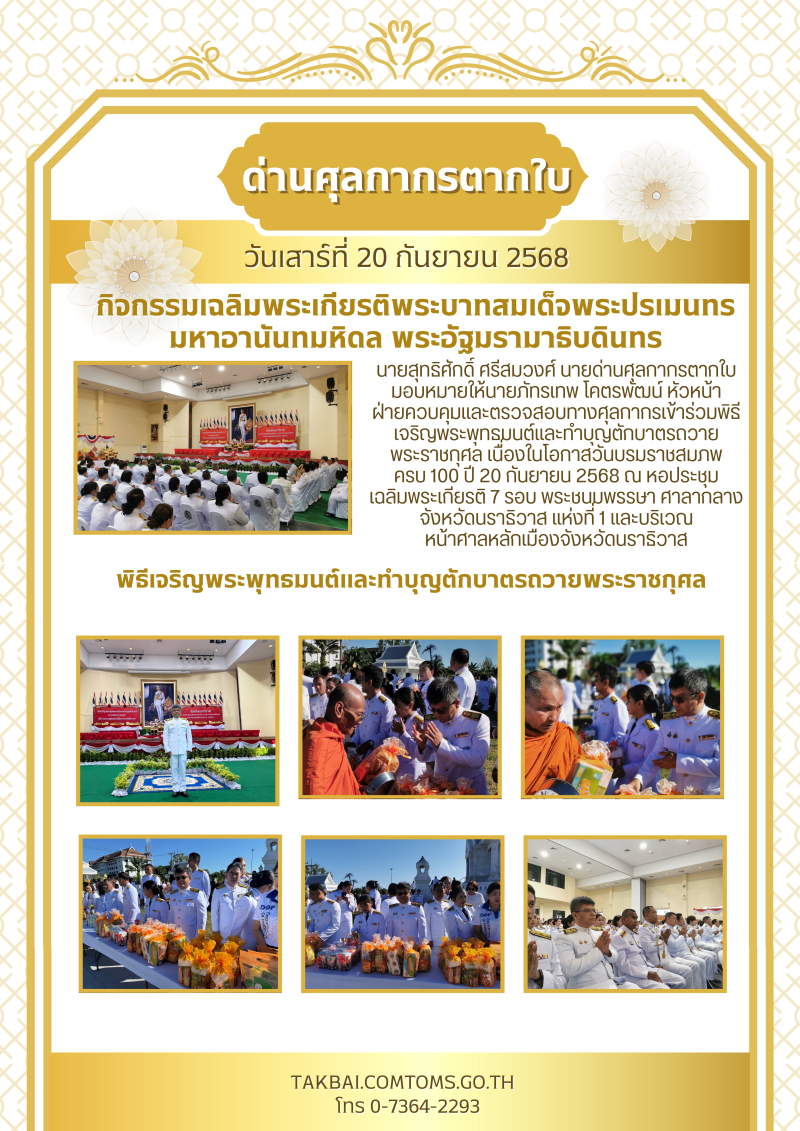 ***ด่านศุลกากรตากใบเข้าร่วมพิธีเจริญพระพุทธมนต์และทำบุญตักบาตรถวายพระราชกุศล เนื่องในโอกาสวันบรมราชสมภพครบ 100 ปี 20 กันยายน 2568***