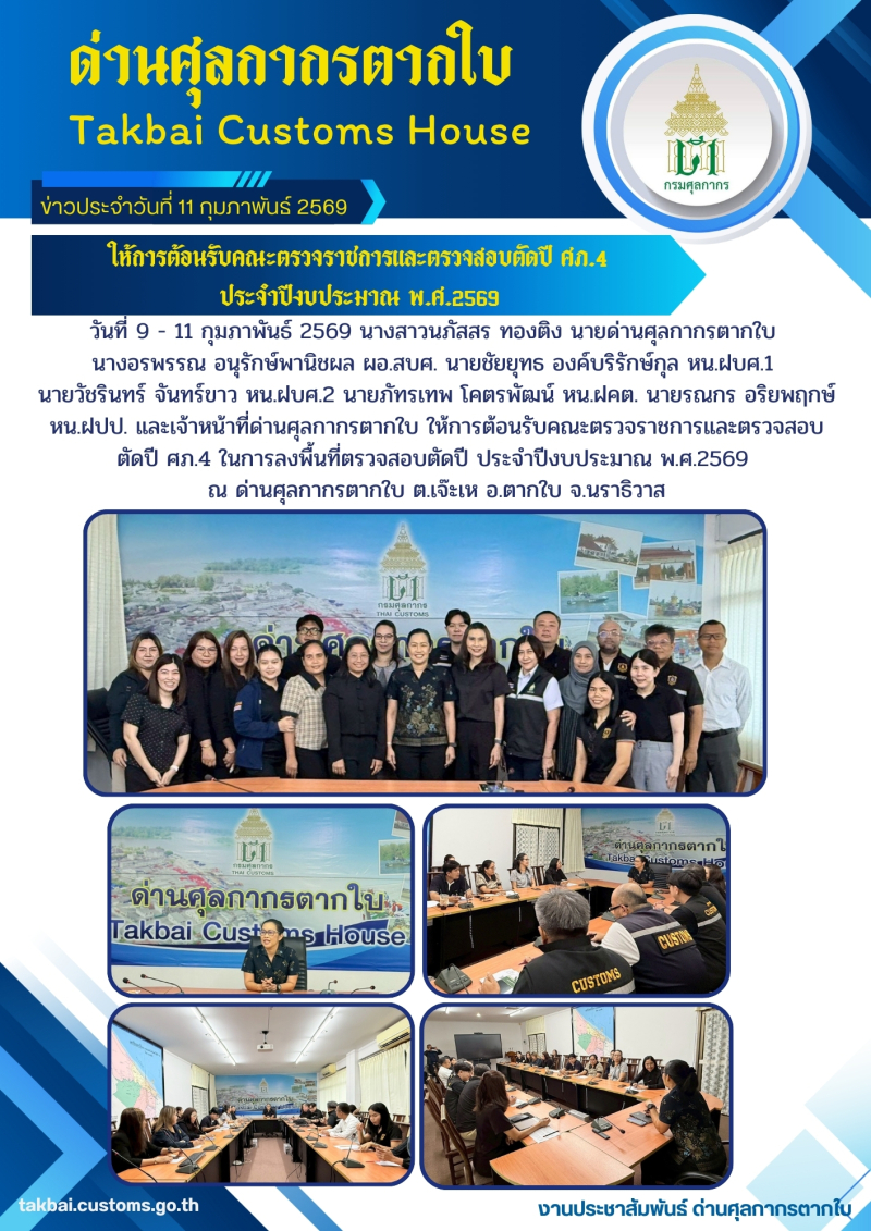 ด่านศุลกากรตากใบ ให้การต้อนรับคณะตรวจราชการและตรวจสอบตัดปี ศภ.4 ประจำปีงบประมาณ พ.ศ.2569