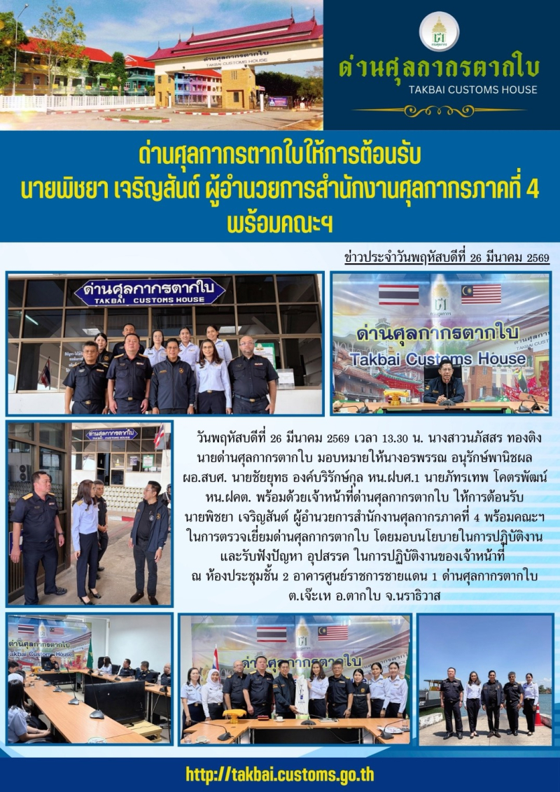 ด่านศุลกากรตากใบ ให้การต้อนรับ นายพิชยา เจริญสันต์ ผู้อำนวยการสำนักงานศุลกากรภาคที่ 4 พร้อมคณะฯ